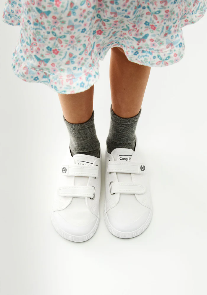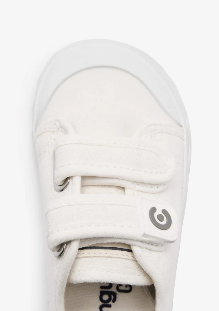 Zapatillas deportivas Goflex Barefoot de lona blanca, un diseño minimalista que las convierte en un básico para el día a día. Incorporan una suela original con detalle de ondas y un práctico cierre de doble tira adherente para para poner y quitar rápidamente.