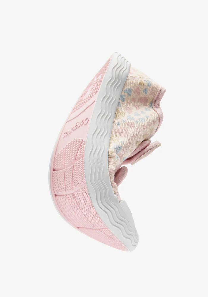 Zapatillas deportivas Goflex Barefoot de lona multicolor en un suave tono rosa con estampado de corazones en tonos pastel y una suela original con detalle de ondas y doble cierre adherente para el día a día.