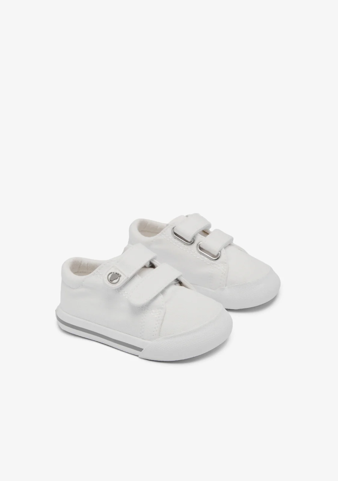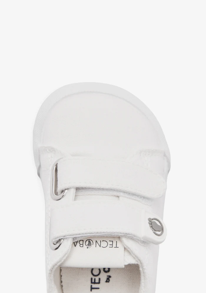 Zapatillas deportivas barefoot de lona blanca, un básico atemporal para el día a día con doble cierre de tira adherente para poner y quitar rápidamente.